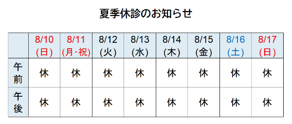 | 診療時間 | 月 | 火 | 水 | 木 | 金 | 土 | 日 | 祝 |